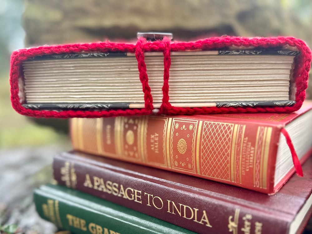 Keep your favorite books cozy in this handmade checkered book sleeve. This crocheted sleeve provides protection for your book from damaged covers, bent pages, pen marks, etc.